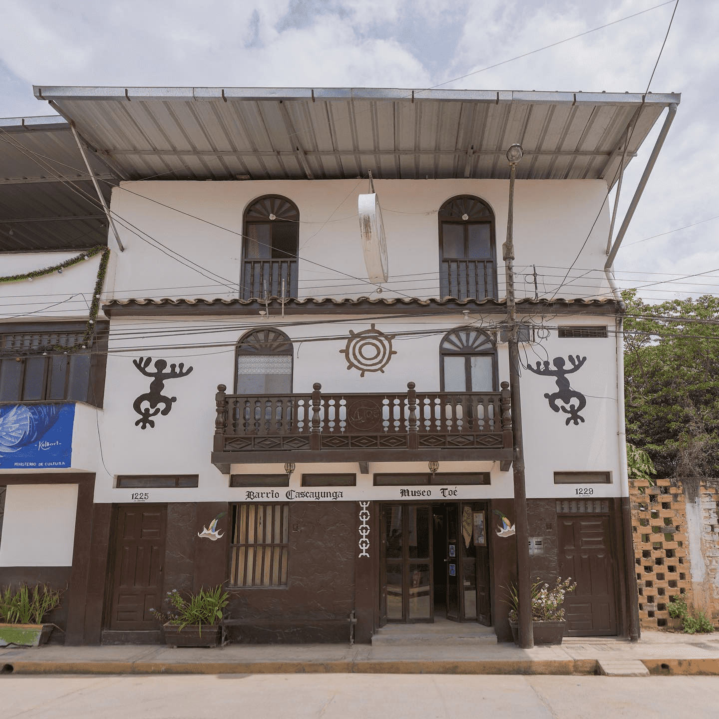 El Museo Etnográfico Toé alberga una colección de objetos antiguos y tradicionales, fruto de más de 35 años de trabajo privado para preservar la memoria, historia y folclore de Rioja y la región San Martín en el contexto amazónico. Su infraestructura cuenta con tres niveles, organizados en salas temáticas. En el primer piso se encuentra el acceso, una recepción con fotografías, armamento, vestimenta tradicional, mitología amazónica y objetos de pueblos indígenas. También cuenta con un auditorio para 80 personas donde se realizan actividades culturales y cívicas, y áreas de descanso con muebles antiguos, bebidas regionales, literatura y artesanía. El segundo piso alberga seis salas temáticas, destacando la historia de Rioja, una colección de billetes, monedas, vasijas y equipos antiguos. Se resalta la importancia de la fibra de bombonaje en la economía local, con exhibiciones del tejido de sombreros y productos artesanales. También hay una galería fotográfica de personajes destacados en la historia, literatura y música, y una sala dedicada al Carnaval Riojano con sus personajes y vestimentas típicas. En el tercer piso, se recrean escenas del hogar tradicional con una réplica de un “trapiche” para extraer jugo de caña de azúcar, una cocina a leña y un horno de barro, junto a utensilios y artefactos domésticos. También se exhiben instrumentos líticos donados, recolectados en el valle del Alto Mayo. El museo forma parte de la Ruta Cultural Museos de San Martín, promoviendo la conservación y difusión del patrimonio cultural regional. Es un destino ideal para quienes buscan experiencias de aprendizaje y conexión con la historia y folclore amazónico, consolidándose como una opción clave para el turismo en la zona urbana de Rioja.
